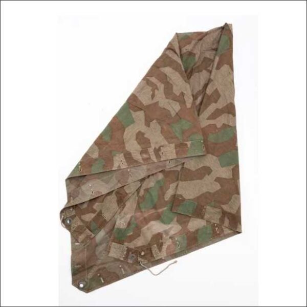 The zeltbahn is made of water-resistant, cotton drill construction and features a printed splinter pattern camouflage finish. None of the original buttons remain, however the attachment ropes are present. It shows minimal fading and some small scattered snags. The overall condition is very good. Please be sure to review all photos.