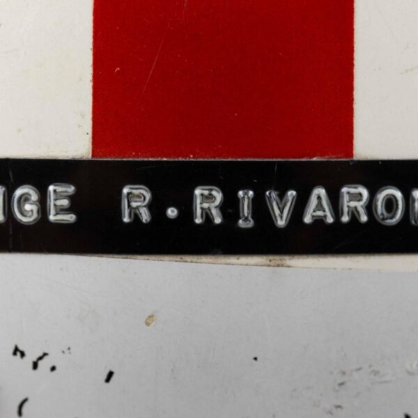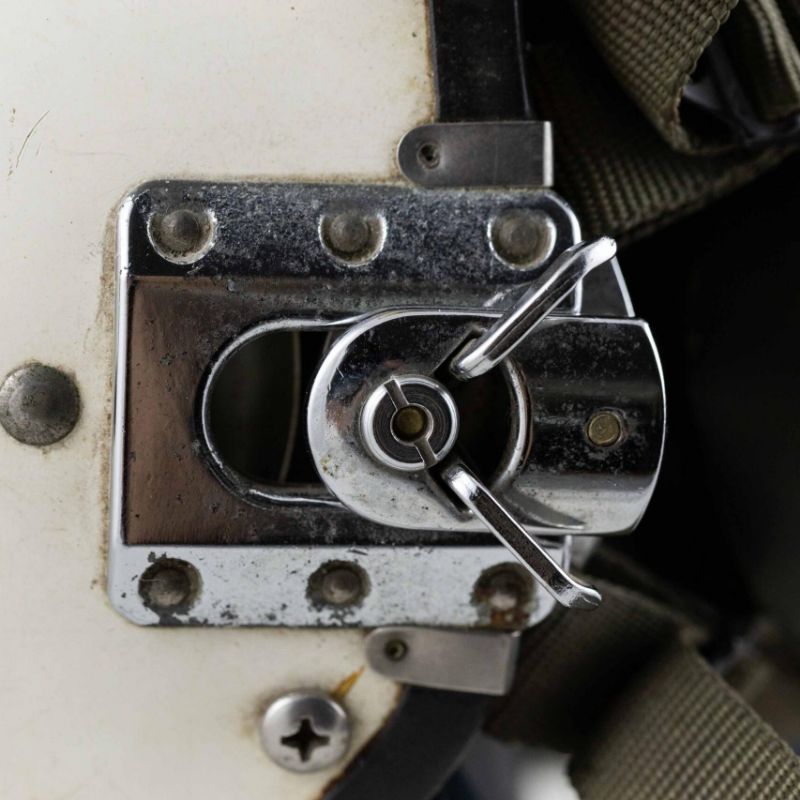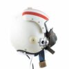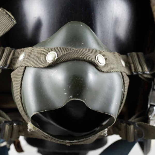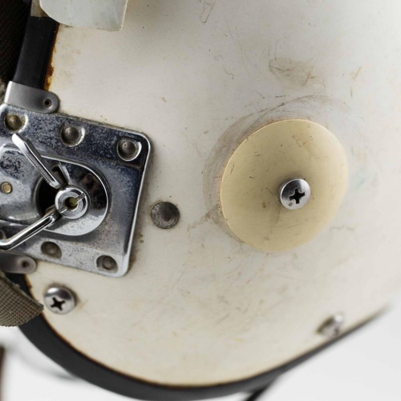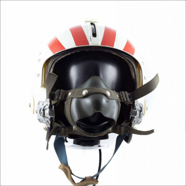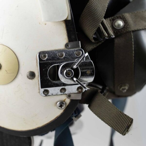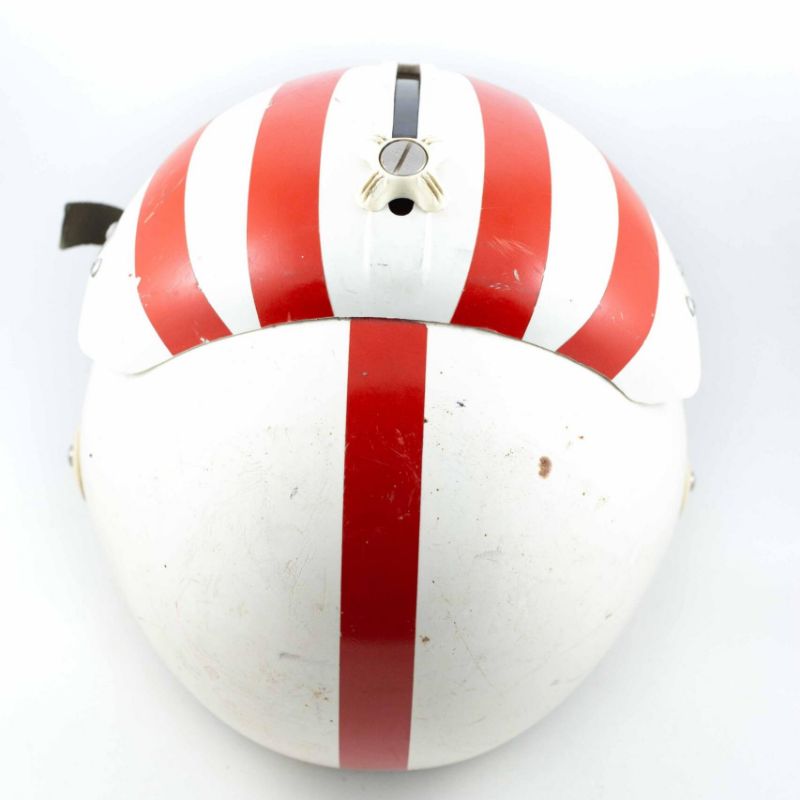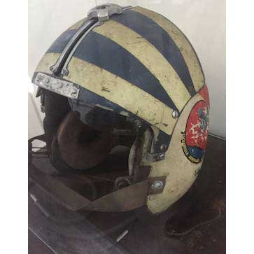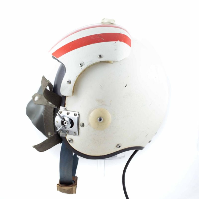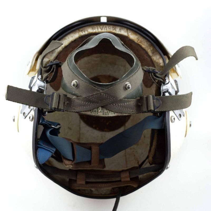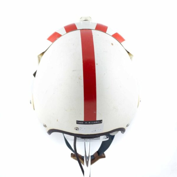 Casco perteciente al Aviador Naval Rodolfo Rivarola, piloto de caza y helicopterista. Se retiro como Capitan de Corbeta en 1973. Fue Centurión, ya que aterrizo 100 veces en los portaviones ARA Independecia y ARA 25 de Mayo. Fue convocado para el conflicto de Malvinas, realizo vuelos trasporte aeronaval y patrullaje marítimo, es VGM. Información provista por su Hijo, Rodolfo German Rivarola.