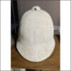 A white cloth covered helmet of cork construction with ventilation to the top. The helmet is lined in green and white cotton with brown leather sweatband. Chinstrap is missing. Size marked “6 7/8”. Not sure of the exact vintage but probably late 1800’s or early 1900’s. Cool looking pith.