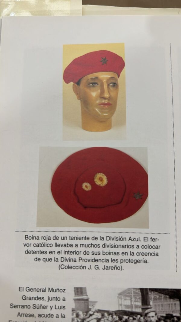 Boina roja de un teniente de la Division Azul. El fervor católico llevaba a muchos divisionarios a colocar ¨detentes¨en el interior de sus boinas en la creencia que la divian providencia les protegeria ) Colección J.G. Jareño)