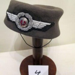 M37 French Air Force helmet. It’s design is similar to the M35 helmet which was used by tank crews, armoured vehicles crews, despatch riders etc. When the French Air Force took up the M37 the colours adopted were blue and black. The liner system and front bumper were also changed to black for the airforce (previously a brown tan colour on other models). There are 2 stamps on this helmet one in white ’57’ size. Another stamp in black but illegible which is probably the date stamp