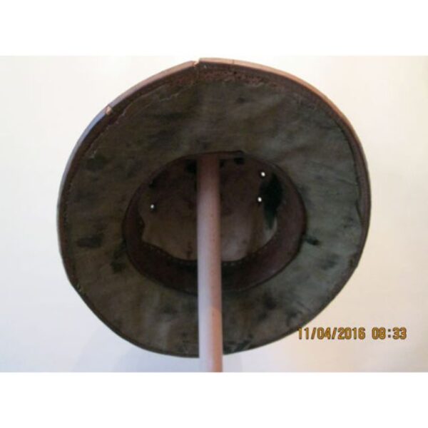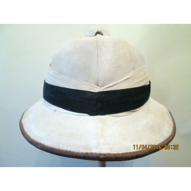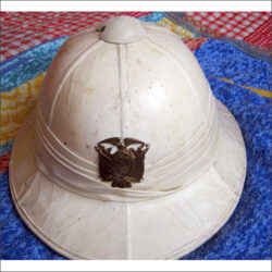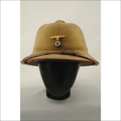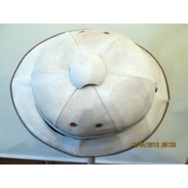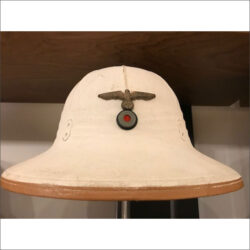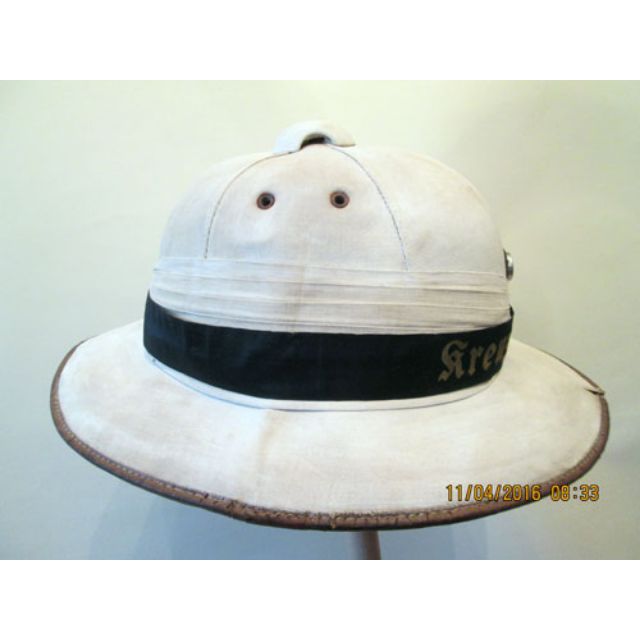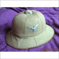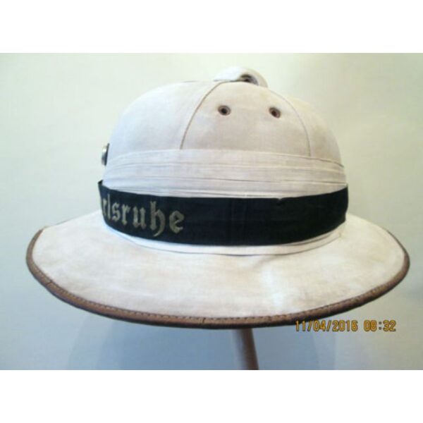 To this helmet the collector told me the history.Acquired on the foreign voyage of the cruiser KARLSRUHE in Port Said around 1930 from the ship’s kitty for the cerw.Around the head part, the cap band of the cruiser is sewn. Above this is the cockade of the Imperial Navy, the eagle with the swastika is not yet applied.This collector will sell his steel helmets after he sold all his pith helmets !