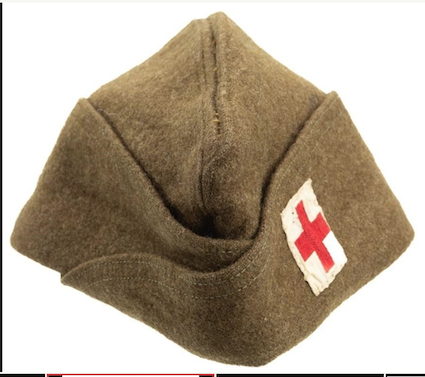 WWI US Overseas Cap – American Red Cross or Medic’s Insignia. This is a WWI US overseas cap with a red cross on a white background stitched onto it. This could be the insignia of the American Red Cross which sent thousands of men and women into Europe during World War I, or it could be a general insignia for a medic. The cap is very good+++.